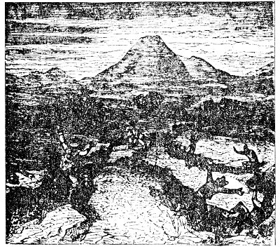 On the 8th of October, 1822, a great earthquake occurred on the island of Java, near the mountain of Galung Gung. "A loud explosion was heard, the earth shook, and immense columns of hot water and boiling mud, mixed with burning brimstone, ashes, and lapilli, of the size of nuts, were projected from the mountain like a water-spout, with such prodigious violence that large quantities fell beyond the river Tandoi, which is forty miles distant. . . . The first eruption lasted nearly five hours; and on the following days the rain fell ill torrents, and the rivers, densely charged with mud, deluged the country far and wide. At the end of four days (October 12th), a second eruption occurred, more violent than the first, in which hot water and mud were again vomited, and great blocks of basalt were thrown to the distance of seven miles from the volcano. There was at the same time a violent earthquake, the face of the mountain was utterly changed, its summits broken down, and one side, which had been covered with trees, became an enormous gulf in the form of a semicircle. Over 4000 persons were killed and 114 villages destroyed." (Lyell's "Principles of Geology," p. 430.)