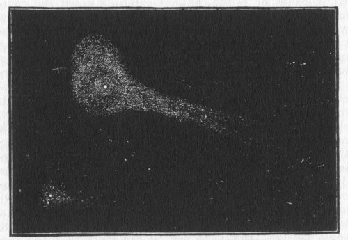 "'On the 30th of November, at sixteen hours, the time of the comet rising here, I was at my post, but hopelessly; clouds and rain gave me no chance. The next morning I had the same bad luck. But on the third trial, with a line of blue break, about 17¼ hours mean time, I found Biela immediately! Only four comparisons in successive minutes could be obtained, in strong morning twilight, with an anonymous star; but direct motion of 2.5 seconds decided that I had got the comet all right. I noted it--circular, bright, with, a decided nucleus, but NO TAIL, and about forty-five seconds in diameter. Next morning I got seven good comparisons with an anonymous star, showing a motion of 17.9 seconds in twenty-eight minutes, and I also got two comparisons with a Madras star in our current catalogue, and with 7,734 Taylor. I was too anxious to secure one good place for the one in hand to look for the other comet, and the fourth morning was cloudy and rainy.'