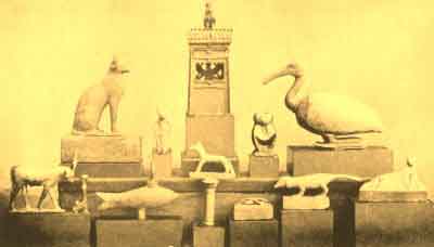 bottom, left to right: Apis Bull; Fish (Lepidotus); Jackal (Anubis); Snake (form of Uazit); Cat with Kittens (Bast).