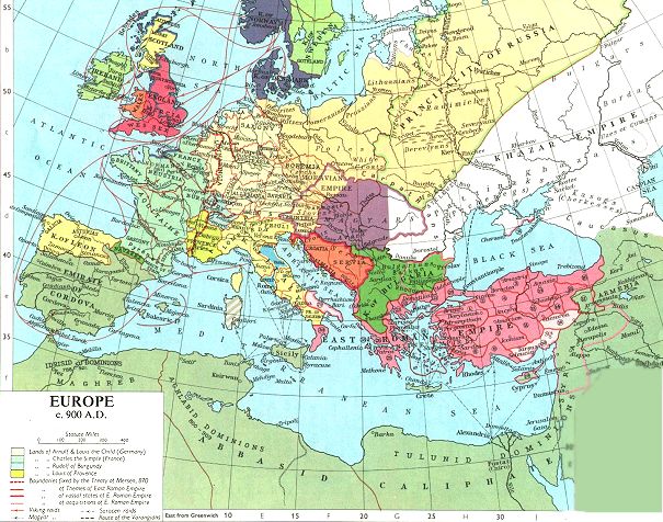 911 AD The Treaty of Saint-Clair-sur-Epte between Charles the Simple, king of the Franks, and Rollo (Hrolf), Viking leader of the Normans, is concluded. The Franks hand over the central piece of land that will become Normandy to the invaders from the north in an attempt to stop their attacks.