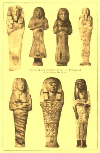 Another mortuary custom was to provide little figures, called Ushebtiu, "the answerers", inscribed with magical formulę, which would obey the dead and perform whatever duties he desired of them in Paradise.