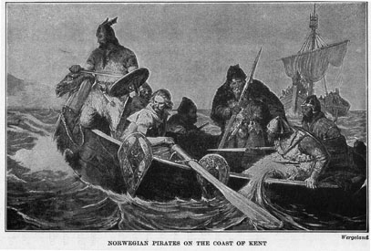 These pirates were mostly Norwegians, whose leader was a barbarian named Kerdric. They would come sweeping down upon the Kentish coast in many ships, make a landing where there were no soldiers, and fall upon the towns and plunder them. Then, as swiftly and suddenly as they had come, they would sail away homeward, before they could be captured.