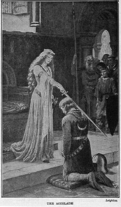 With such a man for their king, the English people became devoted to chivalry, and on every field of battle brave men vied with another in brave deeds. Knighthood was often the reward of valor. Then, as now, knighthood was usually conferred upon a man by his king or queen. A part of the ceremony consisted in the sovereign's touching the kneeling subject's soldier with the flat of a sword and saying, "Arise, Sir Knight." This was called "the accolade."