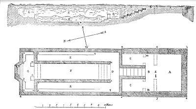 A. Pronaos with colonnade.--B. Entrance to stairway.--CC. Sacristy (apparatorium?)--D. Vestibule.--E. Benches ranged along the sides.--F. Space reserved for celebrants.--G. Apse containing the sacred images.