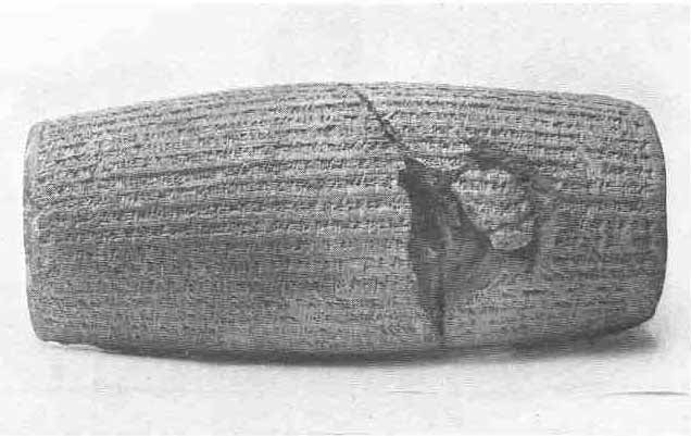 Baked clay cylinder inscribed with an account of the capture of Babylon by Cyrus ( KU-RA-ash) King of Persia, 538 B.C. He restored to their original shrines throughout the country the images of the gods which a former king Nabonidus had collected in Babylon and gave the Jews permission to rebuild their temple. (British Museum No. 90920.)