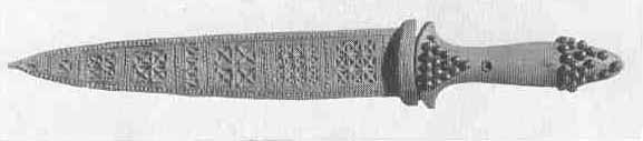 Gold dagger, with a handle of deep blue lapis lazuli studded with gold; the sheath in which it was found is also of gold.