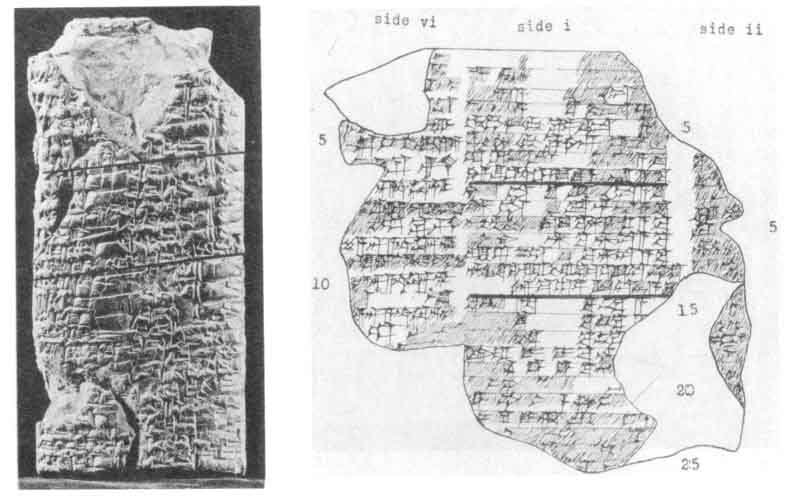The two pieces illustrated here are duplicates belonging to the epic tale, "Gilgamesh, Enkidu, and the Nether World." The one to the left is a tablet (14068 in the Nippur collection of the University Museum) published by Chiera in 1934.36 The one to the right (4429 in the Nippur collection of the Museum of the Ancient Orient at Istanbul) is a fragment of a prism copied by the author and hitherto unpublished. The marked passages contain the lines significant for the creation of the universe; for the translation and the transliteration, see note 37.