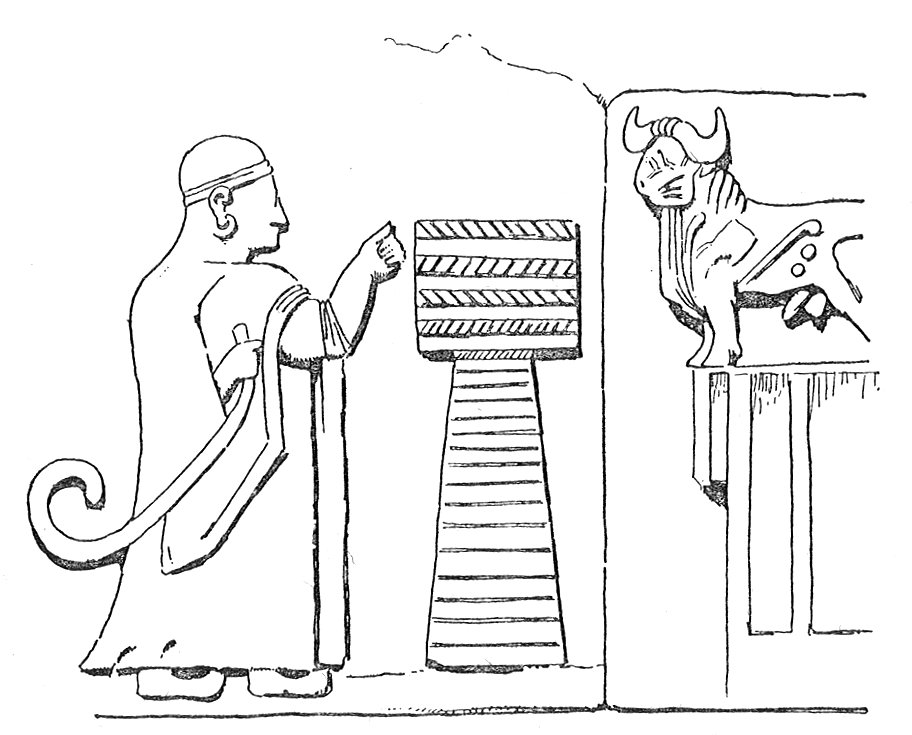 6:17 Our Fig. 1, L. H., pl. xliv., Liv. Annals Arch., ii. (1909), pl. xli (4). Cf. the familiar representation in glyptic art of Hadad leading a bull, e.g., Ward, Seal Cyl. of West Asia, Ch. xxx., figs. 456, 459, 461, etc.