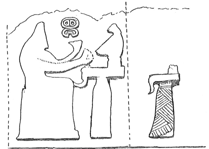 That which seems to us in our present enquiry the chief feature of these sculptures is that the worship is clearly common to the god and the goddess, who occupy the leading positions in equal prominence.28 This interpretation is supported substantially by sculptures which decorate the main entrance of the neighbouring Hittite city of Eyuk. The corner stone on the right represents the goddess seated,29 receiving the worship of her priests; while the corresponding corner stone on the left shows a Bull-God on a pedestal,30 with the High Priest and Priestess ministering at his altar. The Bull we have seen to be identified with the chief Hittite deity, which he seems here to replace.