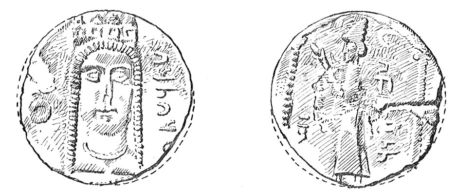 In two cases, however, the figure of the god does survive. One of these coins of the period of Alexander,62 shows upon the obverse the figure of the god seated upon a throne, holding in his left hand a long sceptre, and in the right hand something which is not distinct. On the reverse side of the coin, the goddess is represented clad in long robes, with girdle, seated upon a lion; she holds in her left hand, it would seem, the lightning trident.63